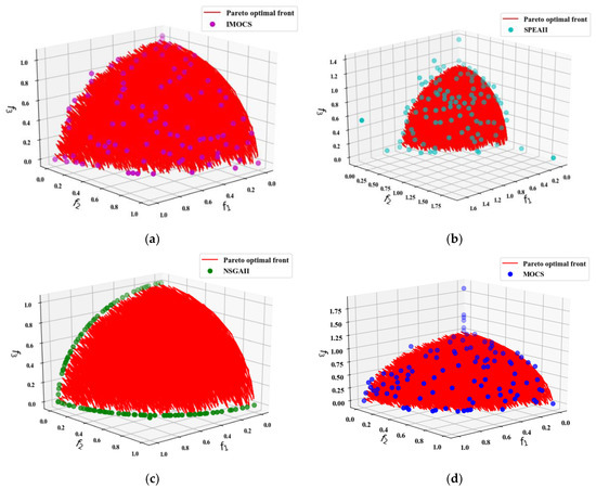 The results of DTLZ2 optimization by four algorithms that can be seen from the data are the IMOCS has obtained good non-inferior solutions in both convergence indicator and density indicator, and its stability is much better than that of the MOCS, SPEAII, and NSGAII. Although the average value obtained by MOCS in the diversity indicator is not much different from that of the IMOCS, some non-inferior solutions are dissociated on the true Pareto front surface, resulting in the diversity of non-inferior solutions obtained by the MOCS being far worse than that of the IMOCS.