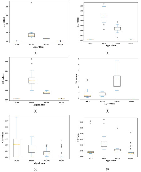 It can be seen from the Equations (14) and (15) that the smaller the GD value, the smaller the distance between the non-dominated solution set obtained by the algorithm and the true Pareto front, and the better the convergence of the algorithm. If , it indicates that the generated non-dominated solution set is on the true Pareto frontier, and the two completely coincide. Compared with HV, the computational cost of GD is lightweight, but only the convergence of the solution set is measured, and the diversity cannot be assessed.