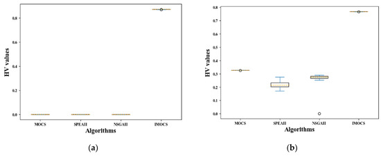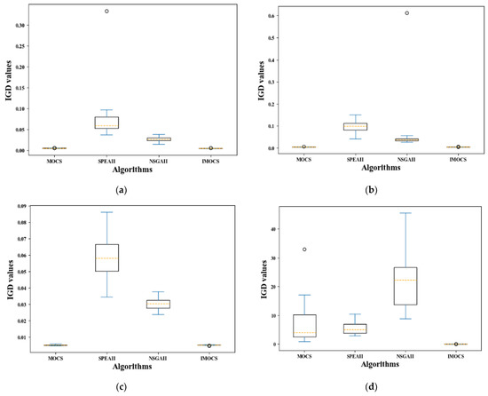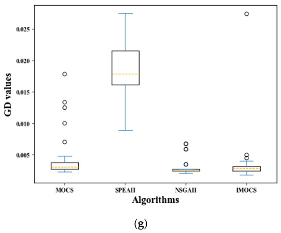Based on the characteristics analysis of the boxplot, the boxplot of IMOCS occupies the smallest area (except Figure 9c), and they are all in the range of 0.001–0.005, indicating that IMOCS has the best convergence performance in the GD indicator relative to the other comparison algorithms. Secondly, the occupied area of the boxplot obtained by the NSGAII is much smaller than the other three algorithms in optimizing the DTLZ4 problem. Moreover, Figure 9a–f show that the area of the boxplot is larger than IMOCS and MOCS and the convergence of NSGAII is worse than IMOCS and MOCS. However, in the process of GD indicator evaluation, the boxplot occupied area obtained by the SPEAII optimization function is the largest of the other three algorithms, implying that the SPEAII algorithm is the worst in terms of convergence. In addition, the MOCS can also get a smaller graph area in the GD indicator, but when optimizing functions such as ZDT4-ZDT6, the graph occupies a larger space (0–1.5, 0–0.17), indicating that the MOCS has relatively poor convergence performance when solving complex problems. It can be seen that the convergence of the IMOCS algorithm has been further improved. It can be seen from Figure 10 that the space occupied by the box diagram of IMOCS and MOCS is roughly similar, while the maximum and minimum values on the box diagram of IMOCS are smaller than those of the MOCS and the number and value of outliers generated by the MOCS in DTLZ2 are larger than those of the IMOCS. While the SPEAII and NSGAII have a large graph span space, it can be seen from the characteristics of IGD that the convergence performance and non-inferior solution diversity of SPEAII and NSGAII are worse than that of the IMOCS and MOCS, but the SPEAII is better than NSGAII. In addition, in Figure 10, the MOCS, SPEAII, and NSGAII obtained corresponding box diagrams on ZDT1-2, ZDT4-5, and DTLZ2, occupying a small HV value, and the abnormal points generated by the three in DTLZ2 can be close to 1, but relative to the entire algorithm, their convergence and diversity are weaker than IMOCS. The HV value corresponding to the position of the IMOCS box diagram is larger than the other three algorithms, which shows that the non-inferior solution searched by the IMOCS algorithm is closer to the true Pareto frontier, and the convergence performance is obviously improved.