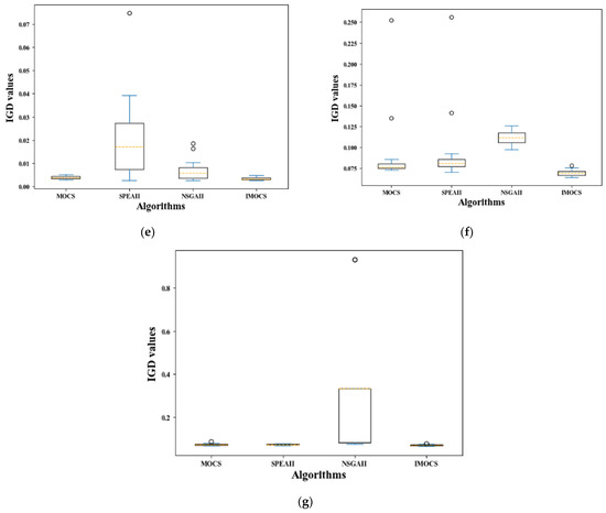 The results of IGD test problem over all algorithms. (a) ZDT1, (b) ZDT2, (c) ZDT3, (d) ZDT4, (e) ZDT6, (f) DTLZ2, and (g) DTLZ4.