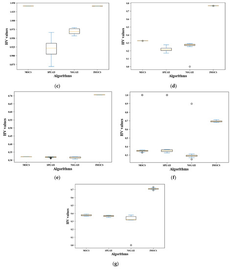 The results of HV test problem over all algorithms. (a) ZDT1, (b) ZDT2, (c) ZDT3, (d) ZDT4, (e) ZDT6, (f) DTLZ2, and (g) DTLZ4.
