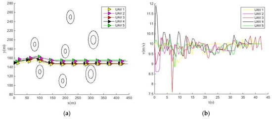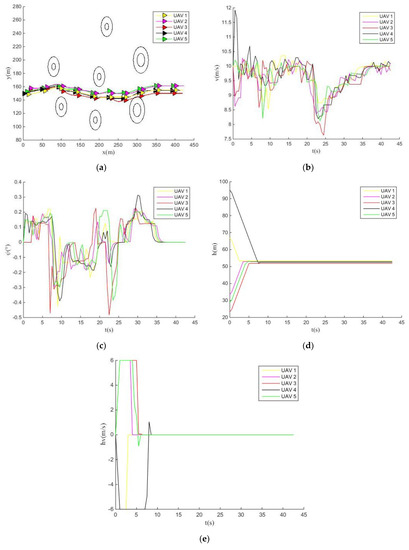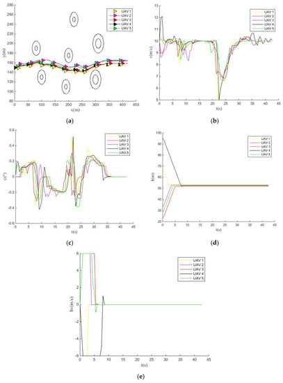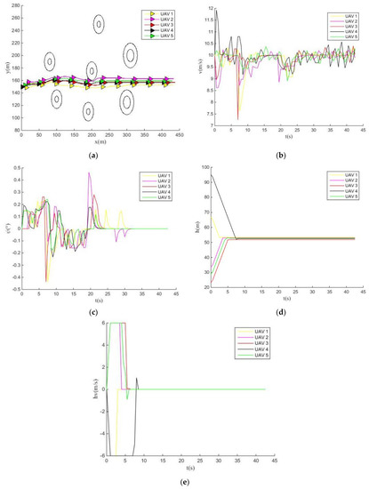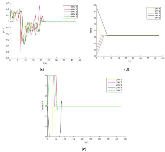 Figure 12a shows that the five UAVs smoothly pass through the obstacles’ information while the obstacles are very closely arranged. Moreover, the five UAVs that failed to detour from the top obstacle were controlled by the control strategy of the UAV to find the shortest safe route and easily pass through the obstacle area. Figure 12b illustrates the horizontal airspeed change curves of the UAVs 1–2, and UAVs 4–5 are converged to 10 m/s at the 38 s, while the UAV3 has fluctuated after 42 s. Since the amplitude of oscillation is within the allowable range, it was also considered consistent with the horizontal airspeed of the other four UAVs. Meanwhile, all UAVs converged to 0rad within 25 s in Figure 12c and remained the same until 42 s. This indicates that the five UAVs flying in the exact directions after 25 s can effectively avoid the obstacle. When the UAV reaches the expected altitude in the vertical direction, the UAVs start from the preset altitude and slowly through the obstacle area during the iterations. Its vertical altitude tends to the expected altitude. Figure 12d exhibits that all UAVs converge to the expected altitude and remain consistent in 10 s, and the altitude rate also is changed. In addition, both UAV1 and UAV4 descended from a height to a position with a vertical altitude of 50 m, and their altitude rate curves (Figure 12e) show an extremely rapid decline from 0 m/s to −6 m/s within 0–2 s. However, the altitude of the UAV1 was relatively lower than the UAV4, and then there was a rapid rise to the expected speed of 0m/s after 3 s. On the contrary, the UAV4 kept a constant decline from 2 s to 7 s until it rose rapidly after 7 s, and finally reached the expected altitude rate converged to 0m/s at 10 s. At the same time, the vertical altitude of UAV2–3 and UAV5 is lower than the expected vertical altitude. It rose rapidly to a constant speed and then changed from a constant speed to a rapid decline, until the altitude rate of all UAVs converged to the expected level at 10 s in this process