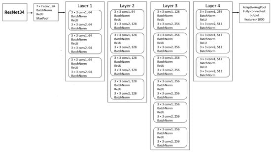 ResNet34 is a convolutional neural network architecture that consists of 34 layers, and it has been used as a classical transfer learning model for Alzheimer’s disease detection. A schematic representation of ResNet34 architecture is shown in Figure 1. It consists of convolution, batch normalization, ReLU, and max pooling operations trailed by four layers: layer 1, layer 2, layer 3, and layer 4. At the end of architecture, ResNet34 includes an adaptive average pooling layer and a fully connected layer that has a 1000-output feature vector.