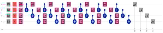 The 512-feature vector given by the residual neural network was converted to 4 dimensions by using a variational quantum circuit. The quantum circuit gives a four-dimensional vector as output. Then, a fully connected layer was used to reduce the four-dimensional vector to a two-dimensional vector. The network learned by means of the variational quantum circuit and the ResNet3 four-feature vector to classify demented and non-demented MRI images. The hybrid quantum neural network, consisting of 512 input features and 2 output features, can be written as follows [30]: