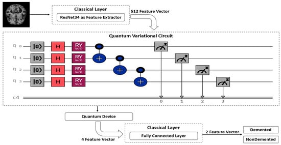 The quantum neural network model is an amalgamation of classical and quantum neural networks. Figure 3 shows a representation of data processing using a classical–quantum neural network. It consists of a feature vector of the classical network, a variational quantum circuit, and a fully connected layer of the classical network that classifies Alzheimer’s disease using demented and non-demented MRI images. In this work, a convolution neural network architecture called ResNet34 was used as a feature extractor. This was used to simplify the given input image into a 512-feature vector. Then, dimensionality reduction was performed using the quantum variational circuit.