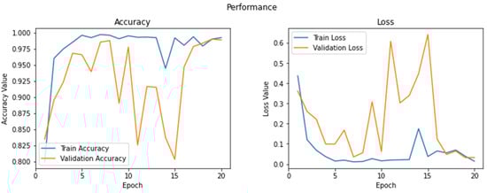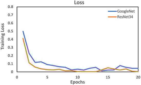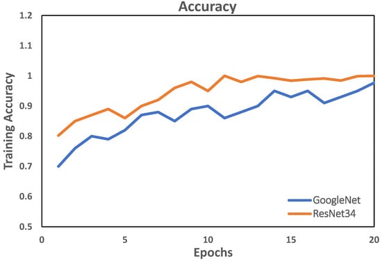 The ResNet model is the most prevalent and effective deep learning model. The residual units are made up of convolutional layers and pooling layers. In this network, a technique called skipping connections was used. Skipping connections skips several layers of training and attaches directly to the output. ResNet34 performed better than GoogleNet in terms of accuracy, precision, recall, and F1-score. Therefore, in this work, the Resnet34 architecture was preferred in terms of training accuracy and training loss with respect to iteration. The training accuracy of ResNet34 was higher than that of GoogleNet. Training accuracy and training loss with respect to epochs are illustrated in Figure 5 and Figure 6.