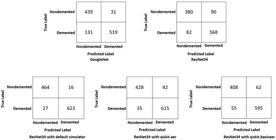 Confusion matrix for the demented and non-demented labels using GoogleNet, ResNet34 and different quantum simulators.
