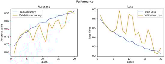 PennyLane library [35] was used for the implementation of the hybrid quantum–classical neural network. The PennyLane ‘default.qubit’ simulator [35] was used for the implementation of the hybrid quantum–classical neural network. ResNet34 was used as a classical neural network and a variational quantum circuit was added to the network for the classification of MRI images. The training accuracy and validation accuracy plots, as well as the training loss and validation loss plots, are shown in Figure 8 for the PennyLane default simulator with ResNet34.