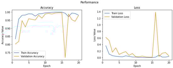 The PennyLane-Qiskit plugin combines the Qiskit quantum computing framework and PennyLane’s quantum machine learning. By installing the PennyLane-Qiskit plugin, Qiskit devices can be obtained in PennyLane. At the present time, three devices are available, named ‘qiskit.aer’, ‘qiskit.basicaer’, and ‘qiskit.ibmq’ [35]. In this work, ‘qiskit.basicaer’ and ‘qiskit.aer’ were used for the implementation of quantum transfer learning. The accuracy plot and the loss plot for qiskit.aer with ResNet34 and for qiskit.basicaer with ResNet34 are shown in Figure 9 and Figure 10.