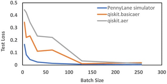 Test loss with respect to batch size for the classical–quantum neural network.