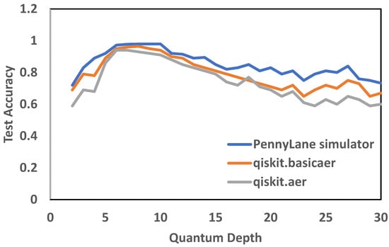 Figure 12 shows a graph of test loss with respect to batch size for the hybrid classical–quantum neural network. Figure 13 shows a graph for test accuracy and quantum depth for the hybrid classical–quantum neural network. The testing accuracy achieved using quantum transfer learning was 0.97 for the default simulator, and 0.94 and 0.95 for the other quantum devices, as shown in Table 6.