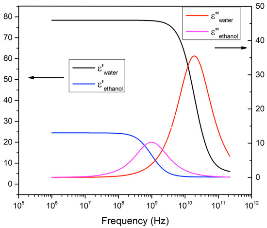 Real (ε′) and imaginary (ε″) components of water and ethanol permittivity as a function of frequency at 25 °C. ε and ε″ values are reported on different vertical scales for better visibility. The curves are Debye functions defined by the parameters reported in [16].