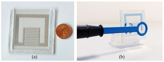 The resonator was fabricated by evaporation of 1.1 µm of Aluminum on a 375 µm polycarbonate substrate. After aluminum deposition, the resonator design was transferred on the substrate using photolithographic techniques. The fabricated resonator was then used to realize the sampling cell. The resonator was inserted inside, as reported in Figure 3, in direct contact with the liquid. The cell used for the analytical measurements was built in-house using multiple structured polycarbonate layers bonded together by solvent bonding [21]. The thickness of the liquid layer in the cell was 1.1 mm.