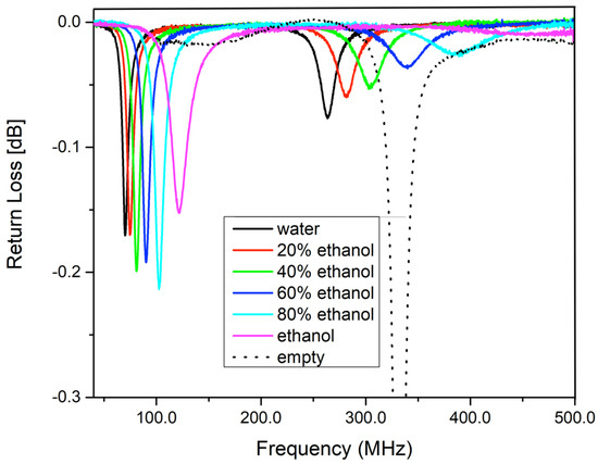 The return loss measured with the sampling cell filled with water, ethanol, and selected mixtures of them are shown in Figure 4. Only the 20%, 40%, 60%, and 80% solutions are shown to enhance. As a comparison, also the return loss of the empty cell is reported.