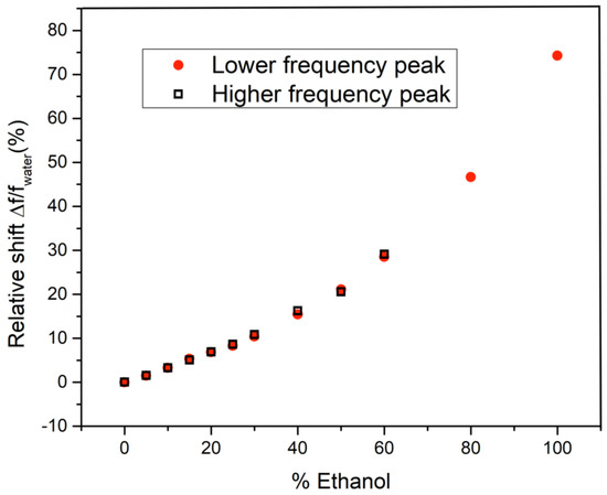 Relative frequency shift Δf/fwater as a function of the ethanol percentage for the lower (red circle) and higher frequency (empty black square) peaks visible in Figure 4.