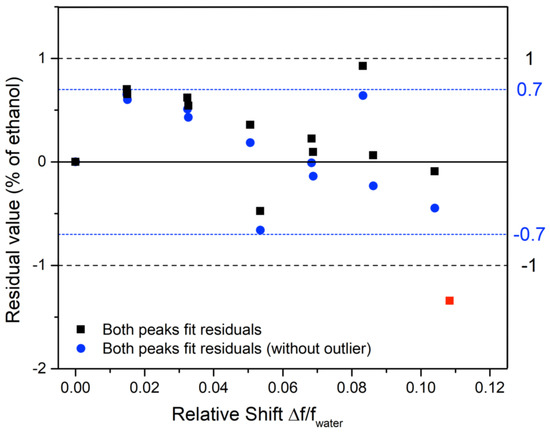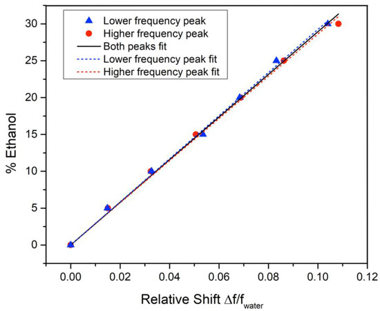 For a more meaningful comparison, we defined the frequency shift Δf as the peak frequency difference between mixture and water and the relative frequency shift Δf/fwater as its fraction of the water peak frequency. In this way, we can compare the frequency variations of the two peaks taking into account the different peak frequency ranges. In this case, as reported in Figure 5, we see that the two peaks overlap perfectly. However, at high ethanol content, only the lower frequency peak is detectable with sufficient precision. The almost perfect overlap is somehow surprising, and it is due to the stability of the ε′ values in the frequency range 50–300 MHz, while the increasing ε″ values in the same range do not affect the peak position. But the most useful information we can obtain from Figure 5 from an analytical perspective is that the data trend is clearly linear in the range 0–30% of ethanol content for both peaks, even though is not linear in all the concentration range investigated. The low ethanol content is the one of greatest interest for the wine and beverages market and considering this we restricted our following analysis to the 0–30% range. Since our purpose is to provide a reliable tool for ethanol content determination, we want to establish what is the detection limit and the intrinsic precision of our methodology. To do this we selected only the data of Figure 5 that fall into the linear region and swapped the x and y-axis to assume that the ethanol percentage is the dependent variable. The data was then fitted assuming a linear dependence of the ethanol content from the relative shift. The formula used for the fit is
