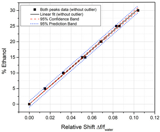 In Figure 7 the residuals are reported for the linear fit of both peaks. All residuals lay within the ±1% of the ethanol concentration, with the only exception of one outlier corresponding to the higher frequency peak of the 30% mixture (red square in Figure 7). This peak is the broadest and least intense peak of the considered interval, and therefore the one with the highest measurement uncertainty. We then decided to remove this point from the data set and rerun the fitting procedure. In this way, the error on the b parameter reduces to 0.73% (Table 1) and the residuals lay within ±0.7% of the fitted ethanol percentage (Figure 7). In Figure 8 the 95% confidence band and prediction band for the ethanol percentage are reported for the fit of both peaks without the outlier. The confidence band is very narrow, and the prediction interval is around ±0.9% of the central value for every concentration.
