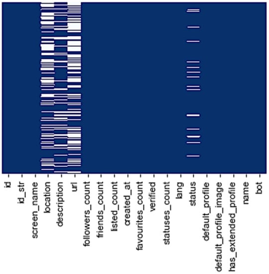 For feature analysis, the missingness of the data provided us with a significant lead in revealing the bot profiles. In Figure 2, the heatmap is highlighted to show the null values in our labelled dataset for each attribute. The graph shows the missingness, particularly in the location, description, and URL attribute. These attributes with null values are not dropped, as they have served as key features in detecting bot behavior and were useful for important deductions.