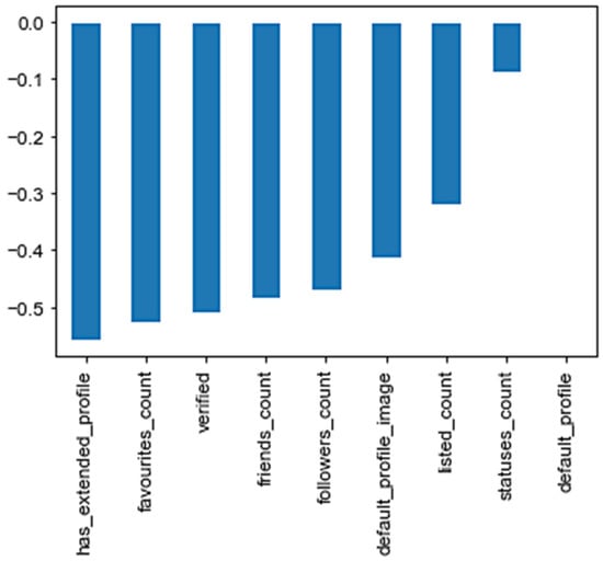 For the Spearman correlation review, further illustration to assist feature extraction is shown in Figure 4. It shows the correlation between the user id, existence of profile image, statuses, and default profile with respect to the target classification variable. It is apparent from the graph that there is a strong correlation between verification status, listed count, and number of friends and followers. As a result, we cannot perform correlation for categorical attributes; hence, we have considered the screen-name, description, and name directly in our feature engineering during training. The correlation study justifies the choice of input variables for model training.