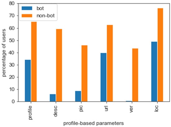 For our exploratory data analysis, we have employed several crux parameters to examine the difference in the natures of a bot and a non-bot profile. This includes inspection of relevant attributes and features that eventually become prominent in our model building phase. Figure 5 illustrates that the bot users often try to conceal their personal information. This is apparent from the graph where most of the profile-based parameters for bots are missing. This indicates collusion in the online social network caused by such suspicious users. A smaller amount of information on the public domain actually helps these bots to rapidly disappear after fraudulent indulgence.