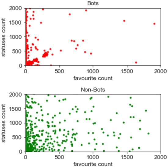 Further, Figure 6 depicts the study of bot characteristics based on statuses and favorite count. The statuses count signifies the number of posts and activities on the feed. The favorites count tells us how many times a certain post has been favorited by a user. The graph shows extremely low favorites counts for the bots on their feeds. In another analysis, shown in Figure 7, the number of followers is spiked for bots with extremely low favorites counts, while the non-bots exhibit a uniform behavior. The bot profiles often indulge in buying followers from online black-marketeers to mimic an influential public status.