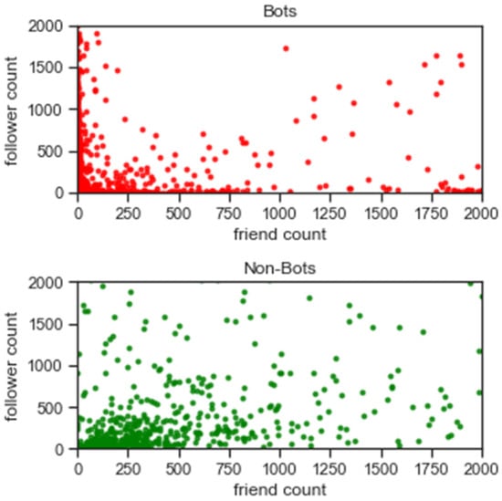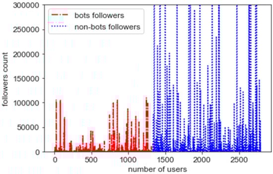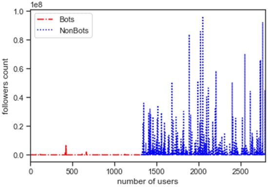 Additionally, in Figure 14, the follower counts of some users, mainly non-bots, is exorbitantly high, while the bots have a similar follower count. This is another key characteristic of the bots and non-bots and their patterns in following and followers.