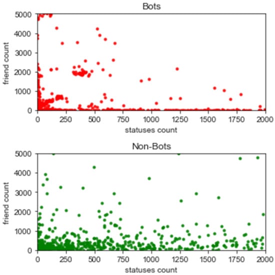 In Twitter, friends are the specific users that a certain user may choose to follow (i.e., following). Figure 8 shows that in the case of the bots, the friend count has a concentration towards the bottom-left, indicating a low following, whereas there is a uniform ratio in the case of non-bots as the number of followers are not exorbitantly high, with friends being relatively uniform till a certain degree. In yet another study of friends and statuses count in Figure 9, it is evident that the bots take parts in short periods of time, and are extremely active during an ongoing event or trend, as depicted by the low number of statuses; while non-bots post over an extended timeline, which could span from months to years, thereby exhibiting normal behavior.