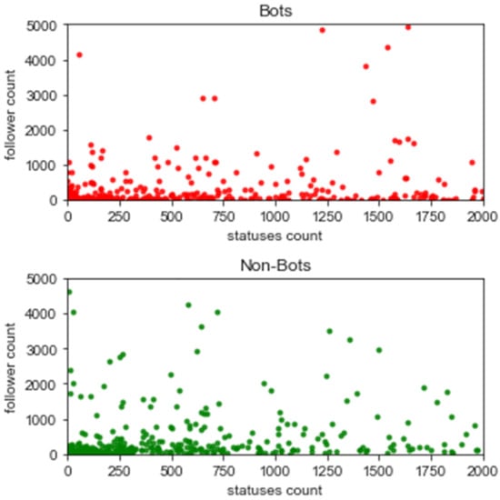 In Figure 10, a key observation was found that bots do not experience an increase in their follower count even when they are posting more and staying extremely active, as a part of their attempt to mimic natural behavior. Meanwhile, for the non-bots, the follower count increases till a certain rate for a number of statuses.