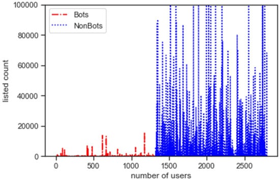 This section provides an extended study on scrutinizing bot behavior, in order to form a sound basis for developing a set of effective filters for our proposed TweezBot. Figure 11 illustrates that the number of users is more with an increasing number of follower counts, thus solidifying our basis of bot and non-bot differentiation. Further, in Figure 12, the non-bots have clearly been added to a number of lists, leading to the increase in the listed count feature, while bots have not added to many lists because of their suspicious nature and lack of credibility, though some bots might also often show non-malicious behavior.
