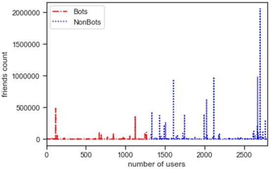 Figure 13 and Figure 14 here help us understand how the bots and non-bots are differentiated in terms of their follower and friend counts. As we can see in Figure 13, the number of users after a certain number has a high number of friends count, which is different to how bots operate.