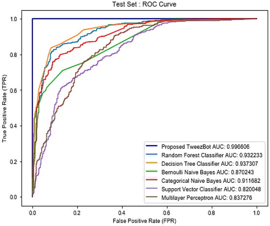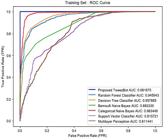 Similarly, in order to obtain a better understanding of how well the model performed when pitted against the classifiers and learning algorithms we used in the aforementioned sections, the comparative study of TweezBot with Random Forest, Decision Tree, Bernoulli Naïve Bayes, Categorical Naïve Bayes, Multi-layer perceptron (ANN) and Support Vector Machine has been shown for the ROC, for both the training set and test set in Figure 16 and Figure 17.