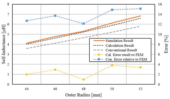 One of the factors the inductance depends on is the size of the coil. As the size of the coil increases, the inductance also increases. The inductance obtained from the conventional method is lower than the calculation and simulation result. Therefore, relative to the simulation result, the error of the conventional method is higher, which is around 16% compared to the error of the calculation result, which is below 4%. Thus, the proposed method offers good accuracy in terms of the outer radius variations.