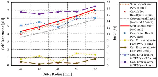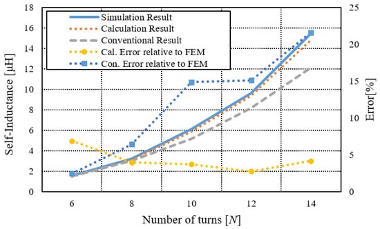 Figure 4 shows the behavior of inductance for the wire diameters 3 mm and 3.6 mm. The values of other parameters are the same as shown in Section 3.1. Compared to large-diameter wire, the inductance of the smaller wire diameter of the coil is higher in the calculation and simulation result. However, the inductance is constant when the diameter of a wire is modified in many conventional formulas because these formulas have not considered the wire diameter. Using the conventional method to compute the inductance, the error is below 17% for wire diameter of 3.6 mm and 20% for w = 3.0 mm when compared with the simulation result, and the error increases as the wire diameter decreases. However, the error of the calculation result is less than 4% for all cases, which verifies its accuracy.