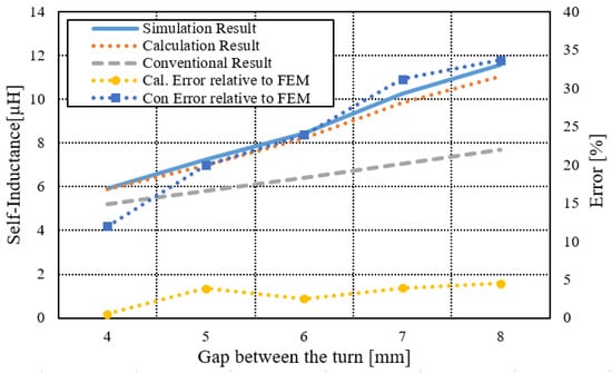 Figure 6 shows the behavior of the inductance of the spiral coil at the different gaps between the turns with w = 3.6 mm, Ri = 10 mm, and N = 10. The geometry of the coil is expended with the increase in the gap between the turns, thus increasing the inductance. The error rises sharply as the gap between the turns’ increases by using the conventional method. However, the calculation result has an error of below 5% for the increase in the gap between the turns. Thus, these comparisons confirm the validity of the calculation result for different variations in the geometrical parameter of the spiral coil.