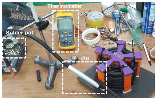 The wire diameter, which is one of the factors affecting the inductance, can be reduced during soldering. Therefore, proper process and precaution are needed for good-quality soldering. The temperature of the soldering material (lead) has to be distributed equally inside the soldering pot, and it is better to choose the soldering material with fewer impurities. The soldering temperature changes with the type and the width of the wire. Thus, the temperature should be regulated and checked with a thermometer. Finally, a special jig and proper soldering set are required as shown in Figure 7.