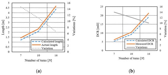 The length of the wire is proportional to its DC resistance. Therefore, it is important to compute the length of the wire and the resistance. The total length and the resistance of the wire can be calculated by Equations (20) and (21). Furthermore, the calculated and the actual length and DC resistance of the wire are shown in Figure 8a,b. The DC resistance is measured using Gwinstek LCR-6020.