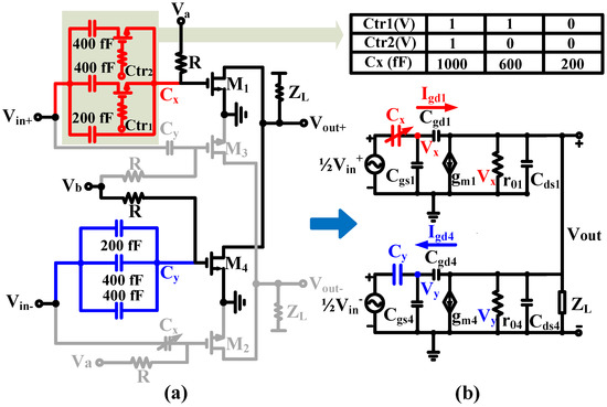 The core idea behind the proposed asymmetric capacitor-based reconfigurable technique was to connect asymmetric capacitors Cx and Cy in series on the gate nodes of transistors (M1–M4), respectively, as shown in Figure 2a. It should be pointed out that since the value of Cx is different from Cy, it is called asymmetric capacitors. Adjusting the values of asymmetrical capacitors provides another dimension of gain control, and hence, reconfigurable gain tuning range and gain step can be achieved. Figure 2b depicts the structure of the applied asymmetric capacitors. To achieve three configurations, the adjustable capacitor Cx was designed to be composed of three capacitors and two switching transistors, which are controlled by the bias voltage of Ctr1 and Ctr2. In addition, to ensure the reconfigurable effect, it is necessary to ensure that the designed capacitances of the asymmetric capacitors are as close as possible to the desired theoretical value. Based on this, both of the asymmetric capacitors used in this study were metal insulator metal (MIM) topology, because of its high resistance to process deviation. Meanwhile, Cx and Cy used similar capacitor arrays.
