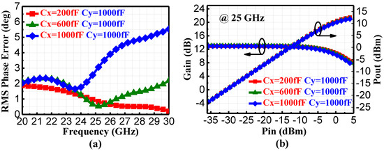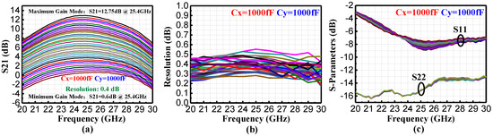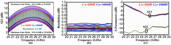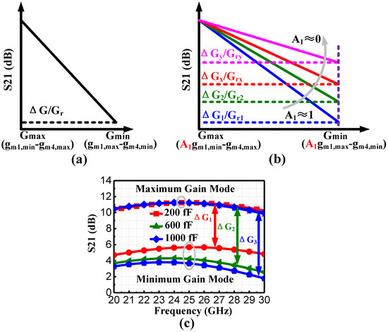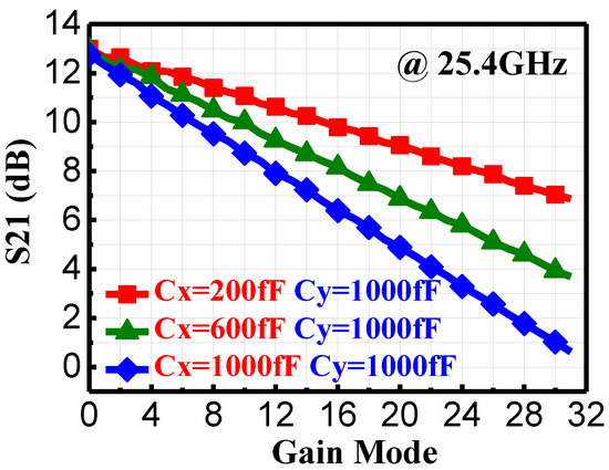 where n is the control bits of the DAC. According to (4) and (5), the proposed asymmetric capacitor-based reconfigurable technique provides a new method to configure ΔGmax and Gr by adjusting the coefficients A1 and A2. Meanwhile, in order to keep the maximum gain of the VGA, it is needed to set A2 ≈ 1. As shown in Figure 4a,b, the conventional methods are only obtained ΔGmax and Gr by controlling transconductance gm of the transistors, whereas the proposed technique achieves another dimension for ΔGmax and Gr control. When A1 is varied from 1 to 0, ΔGmax and Gr will be reconfigured. When the asymmetric capacitors Cx and Cy are designed to be greater than 1000 fF across 20–30 GHz, it can be calculated from (2) and (3) that the values of the coefficients A1 and A2 are approximately equal to one. Conversely, when they are smaller than 1000 fF, the values of A1 and A2 will be less than one. Thus, the gain tuning range and gain step can be reconfigured, which is adjusted to capacitors Cx and Cy.
