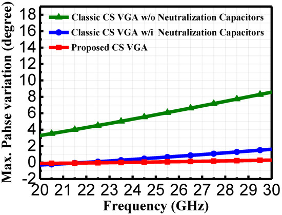 Figure 5 plots the simulated maximum phase variation in the classic and proposed active neutralization-based CS VGAs across 20–30 GHz under the same gain adjustment range. Both simulations were conducted based on the same circuit configuration. Across 20–30 GHz, the maximum deviation of the phase variation in the proposed VGA with active neutralization technique was below 0.3° during gain tuning. In contrast, the maximum phase variation results for the two classic CS VGAs were relatively large. Among them, one VGA with conventional CCCN technique exhibited the maximum phase variation of 1.6°, while another VGA without any neutralization techniques showed 8.6° phase variation at 30 GHz. These results fully illustrate two points: (1) the proposed VGA with active neutralization technique can effectively eliminate Cgd and achieve low phase variation; (2) good phase compensation can be realized in the wide frequency band, which is very suitable for broadband VGA design.