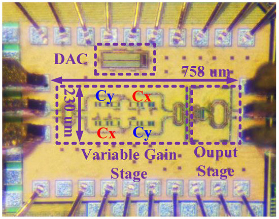The proposed reconfigurable digitally controlled CS VGA was fabricated in a 65 nm CMOS process, and its die micrograph is presented in Figure 6. In the case of not including PAD, the core area of this chip was 0.758 mm × 0.23 mm. The two-stage VGA had a total power consumption of 98 mW with a 1 V supply, and the selection of 1 V supply voltage followed the vendor’s recommendation under the corresponding process node. It is worth mentioning that, to achieve active neutralization, the auxiliary pairs in the proposed structure were on, which consumed slightly extra power to maintain the same gain. Even so, the total power consumption of the variable gain stage with the DAC was only 29 mW (including auxiliary pairs). The VGA presented in this paper consumed relatively high power consumption, which is because it achieved large output power. If a system does not need such high output power, the bias voltage of the output stage can be decreased, and the total dc power consumption of the proposed VGA would be reduced accordingly.