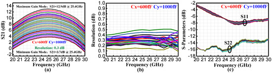 The VGA gain was controlled by Va and Vb, which were generated by the designed seven-bit DAC. The measured 32 states of gains under different control modes are shown in Figure 7a, Figure 8a and Figure 9a, respectively. It can be observed that the proposed VGA achieved a 12.2/9.2/6.1 dB gain tuning range, respectively, when the bias voltage of Ctr1 and Ctr2 were configured from 11 to 10 and then to 00 (Cx varying from 1000 to 200 fF, stepping 400 fF). Implementation of a 6.1 dB gain tuning range was aimed to insert loss compensation of PSs in phased array systems. Implementation of a 12.2 dB gain tuning range was intended for gain tuning in each element to suppress the sidelobes. As for the intermediate state, it was a compromise that was reserved according to actual design requirements. Meanwhile, the peak gain remained basically constant with the changes in Cx. The measured 3 dB bandwidth was as wide as 7.6 GHz, from 21.4 to 29 GHz, with an approximately 13 dB peak gain.