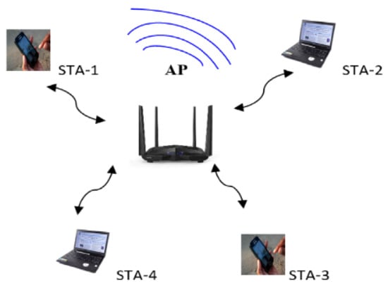 The network topology consists of a single AP with four antennas located in a fixed position at the center of the network. Since user selection is not considered in this study, a maximum of four stations are assumed which are randomly located from the AP. Both the AP and the STAs are stationary. Although some STAs may be equipped with multiple antennas, in this study we focused on stations with a single antenna. The AP can transmit independent data streams in parallel by using the MU-MIMO technique to the STAs up to the number of antenna (NAnt = 4) at the AP, under the assumption of ideal channel orthogonality and ideal spatial channel separation between the spatial streams [9]. Figure 1 illustrates the network topology model.