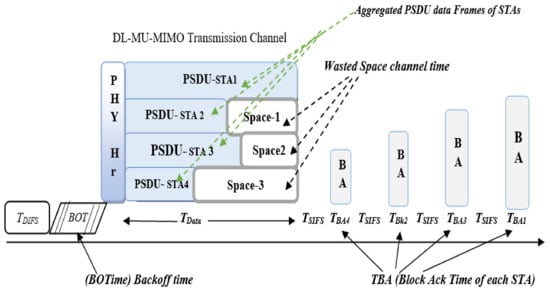 Due to the rapid growth of wireless users and traffic demand in communication network, Wireless Local Area Network (WLAN) development has introduced different technologies to support the performance of the network. MAC layer aggregation is among the technologies introduced in the IEEE 802.11 n/ac standards to accommodate the increasing traffic demand in current WLANs [1,2,3] to support aggregation of multiple frames directing to the same station (STA) into a single wireless frame. This allows for a reduction in the signaling overhead per frame transmission. Moreover, to accommodate the huge demand of users’ requests and data transmission speeds in WLAN, the IEEE 802.11 ac standard also provides Multiple-User Multiple-Input Multiple-Out (MU-MIMO) technology at the physical layer. This technology enables the parallel transmission of multiple user frames at a time, forming virtual spatial transmission channels between the AP and the multiple receiving STAs [4,5,6]. Moreover, the combination of MU-MIMO and MAC layer frame aggregation approaches can significantly improve the system performance of WLAN [5,6]. However, due to the heterogeneous traffic demand among spatial streams, the advantage of multiuser (MU) data transmission is not always achievable in downlink MU-MIMO transmission. In the WLAN downlink MU-MIMO channel, a group of multiplexed frames are constructed such that all users’ frames have an identical transmission duration. However, if the data transmission duration among spatial streams is different, ‘space channel time’ will occur [5,7,8,9,10,11]. Space channel time is a time duration where some of the streams carry user data while the others do not.