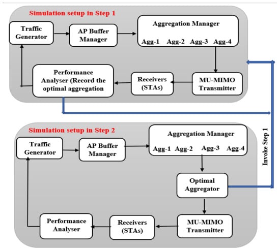 All Agg FA (Baseline Approach) is used as a baseline aggregation algorithm to compare the performance of the proposed adaptive aggregation algorithm. All Agg FA (Baseline Approach) follows a FIFO aggregation, which allows larger frame size aggregation as much as the maximum aggregation size is allowed per transmission. Equal Frame Size FA emphasizes the equalizing of the number of frames aggregated in all spatial streams to allow the aggregated frame length equal in all streams. In this aggregation approach, a station with the shorter frame size in its buffer always selected to determine the aggregated A-MPDU frame size of all the other STAs in the stream. Equal MPDUs Agg FA aggregation policy considers equal number of MPDUs to aggregate frames on each stream, and Avg Num MPDUs FA aggregation considers average number of MPDUs to aggregate frames on each stream [11]. Since the performance of different aggregation policies performs differently under the dynamic effects of traffic patterns and channel conditions, the determination of the optimal aggregation policy which provides the maximum system performance is challenging. To tackle these challenges, we perform the simulation setup in two steps: The simulation setup in Step 1 performs the optimal aggregation policy selection strategy under the different channel conditions (SNR = 3,10, or 20 dB), traffic models (Pareto, Weibull, or fBM), and number of STAs. Figure 3 illustrates the procedure in Step 1. Once the traffic is generated and buffered in Step 1, the Aggregation Manager aggregates the data frame of each user, employing the four different aggregation policies as depicted in [11], such as (Agg—1, Agg—2, Agg—3, and Agg—4), which represent (All Agg FA (Baseline Approach), Equal Frame Size FA, Equal MPDUs Agg FA, and Avg Num MPDUs FA) aggregation policies [11], respectively. Then, the aggregated data frames of each aggregation policy are transmitted one by one to the receiving STAs (Receivers) using the MU-MIMO technique, thus the receiving stations receives different aggregated frame size obtained from different aggregation polices. Then, the Performance Analyzer evaluates the performance of each aggregation policy, determining which provides the maximum system throughput performance, and records the optimal aggregation policy. Therefore, from all possible frame sizes obtained from the different aggregation policies, the optimal system frame size is the one obtained from the optimal aggregation policy.