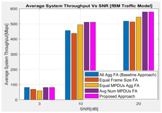 Figure 4 and Figure 5 demonstrate the system throughput performance under the effects of channel conditions and number of users, respectively. Figure 4 shows the performance of system throughput under various channel conditions, fBM traffic model, traffic mix of 50% VoIP and 50% video communications, and NumSTA = 4. As the simulation result shows, the system performance increases when SNR values increase, so the maximum performance of 589 Mbps is achieved when SNR = 20 dB. This shows that the system performance increases when the channel quality improves with respect to the higher SNR values. This is due to the reduction of the frame error occurrence rate in the system. As the result shows, the proposed approach achieved the maximum performance in all channel conditions due to the employed dynamic adaptive aggregation selection scheme that maximizes the system throughput as compared to the All Agg FA (Baseline Approach). According to this experiment, Avg Num MPDUs FA contributed to the optimal aggregation strategy in SNR = 10 dB and 20 dB.