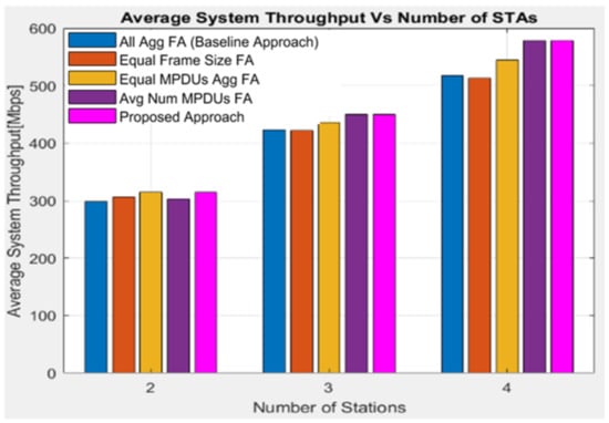 We also perform a simulation experiment to examine the performance of system throughput under the effect of number of STAs, fBM traffic model, traffic mix of 50% VoIP and 50% video communications, and NumSTA = 4. Figure 5 shows the performance of the proposed approach compared with different aggregation policies when the number of STAs changes from 2 to 4 and under SNR = 10 dB. According to the result, as the number of STAs increases, the system throughput performance increases. This is due to the fact that when the number of users in the system increases, the number of frames generated in the system increases. According to the result, Equal Num MPDUs FA contributed the maximum performance of 310 Mbps when NumSTA = 2, and Ave Num MPDUs FA when NumSTA = 3 and 4. This result shows that the aggregation policy used is affected by the number of users in the system. Due to the adaptive nature of the proposed algorithm, better performance is achieved in all conditions as compared to the All Agg FA (Baseline Approach). Then, 578 Mbps maximum performance is achieved when NumSTA = 4. A significant outcome of this experiment is that the number of users in a system could affect the determination of the optimal aggregation policy in the network. In this regard, the proposed approach achieved better performance by employing a dynamic adaptive aggregation selection scheme.