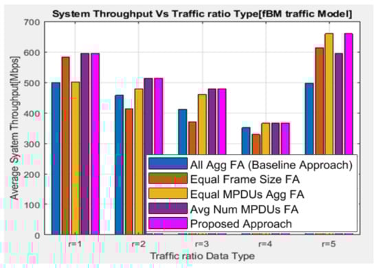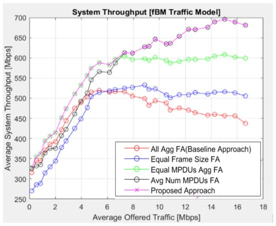 Similarly, the simulation result in Figure 9 demonstrates the performance of system throughput using fBM traffic model. As the results show, Equal MPDUs Agg FA contributed the maximum performance of up to 6 Mbps Average traffic load, and Avg Num MPDUs FA contributed beyond 6 Mbps. However, the proposed algorithm achieved the maximum performance of 700 Mbps by adaptively selecting the optimal aggregation policy throughout the simulation time, thus achieving better performance compared to the baseline All Agg FA approach.