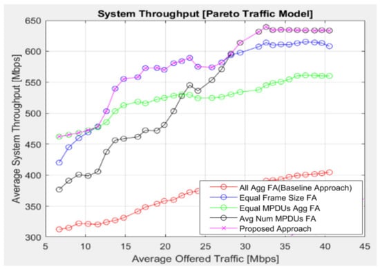Figure 7 shows the performance using the Pareto traffic model. As the results show, a particular aggregation strategy cannot achieve maximum performance when the traffic load increases. This result shows that different aggregation policies perform differently due to the effects of the traffic pattern in this channel condition. As the result shows, the combination of Equal Frame Size FA, Avg Num MPDUs FA, and Equal Num MPDUs FA aggregation policies contributed to the maximum performance in this traffic model. However, due to the employed adaptive aggregation selection procedure in the proposed approach, the maximum system performance is achieved throughout the simulation time. A maximum of 647 Mbps is achieved, compared to All Agg FA (Baseline Approach) which had the lowest, at 410 Mbps.