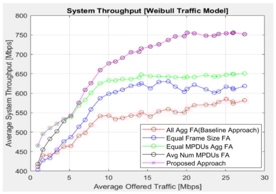 The simulation result in Figure 8 shows the performance of the system throughput using Weibull traffic load. In this traffic model, Equal Num MPDUs FA contributed to the optimal aggregation policy when the traffic load increased, particularly after 5 Mbps. However, the proposed approach achieved the maximum performance of 755 Mbps, compared to all approaches throughout the stimulation time employing the dynamic adaptive aggregation selection scheme. All Agg FA (Baseline Approach) achieved the poorest performance.