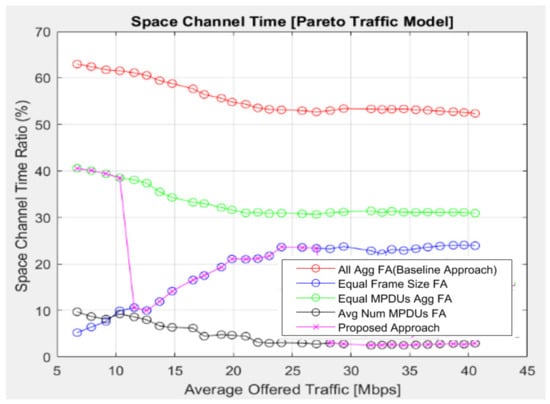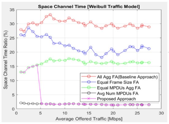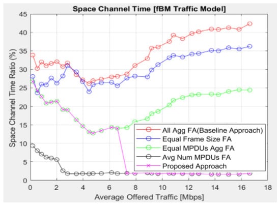 Figure 12 shows the performance of wasted space channel time using the fBM traffic model. As the result shows, different aggregation policies achieve different space channel time performance. However, the proposed approach achieved the minimum performance particularly after the offered traffic load was beyond 7 Mbps. Therefore, better performance is achieved compared with the baseline All Agg FA approach. According to the results, the proposed approach achieved better performance in the fBM and Weibull traffic models than in Pareto.